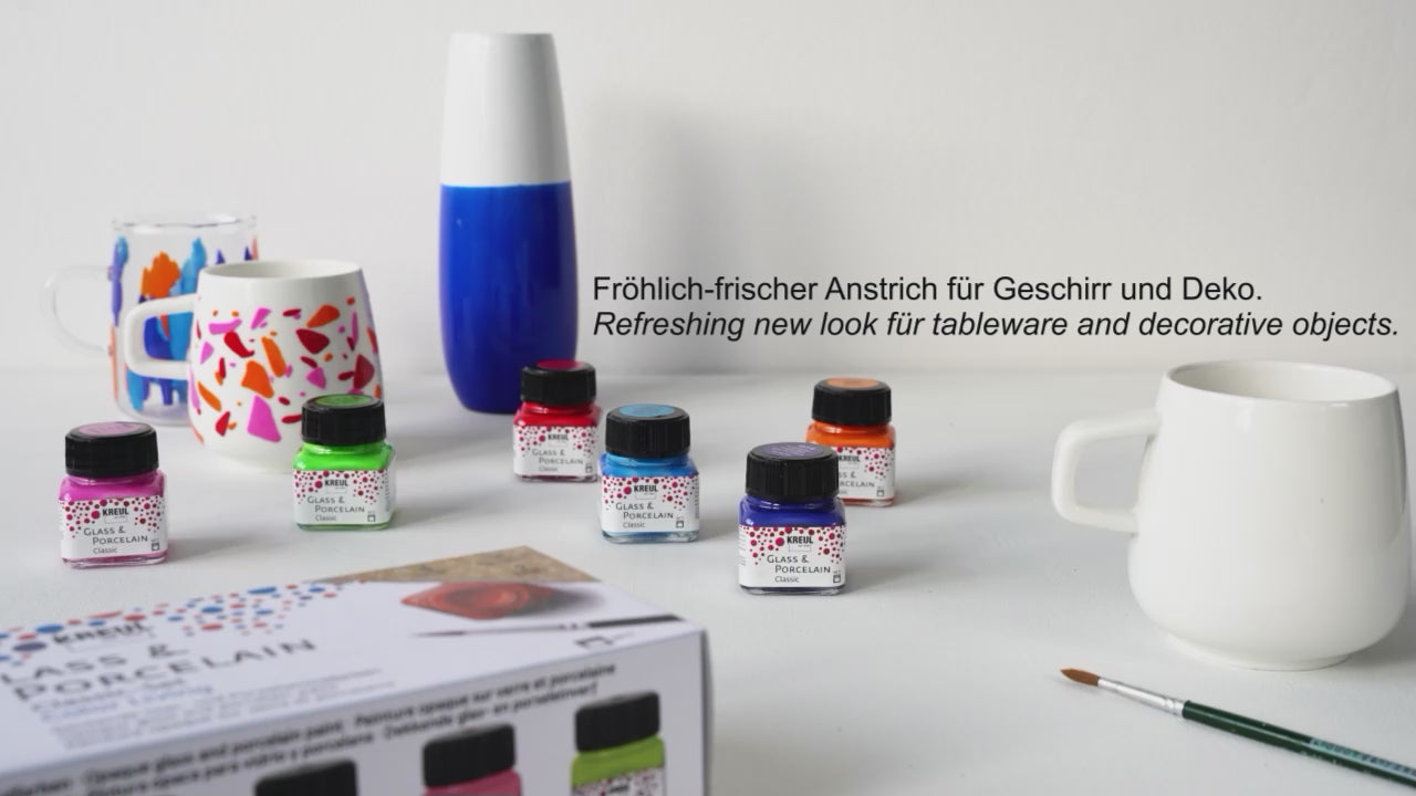 • So geht’s: Nutz und Essbereich frei halten. Farben nicht mit Wasser verdünnen - KREUL Glass & Porcelain Farbverdünner (Art.-Nr. 16273) verwenden. Solange die Bemalung nicht eingebrannt ist, kann diese mit Wasser entfernt werden. Nach einer Trockenzeit von 4 Stunden in den kalten Backofen stellen und 90 Min. bei 160 °C fixieren. Im Backofen auskühlen und aushärten lassen.